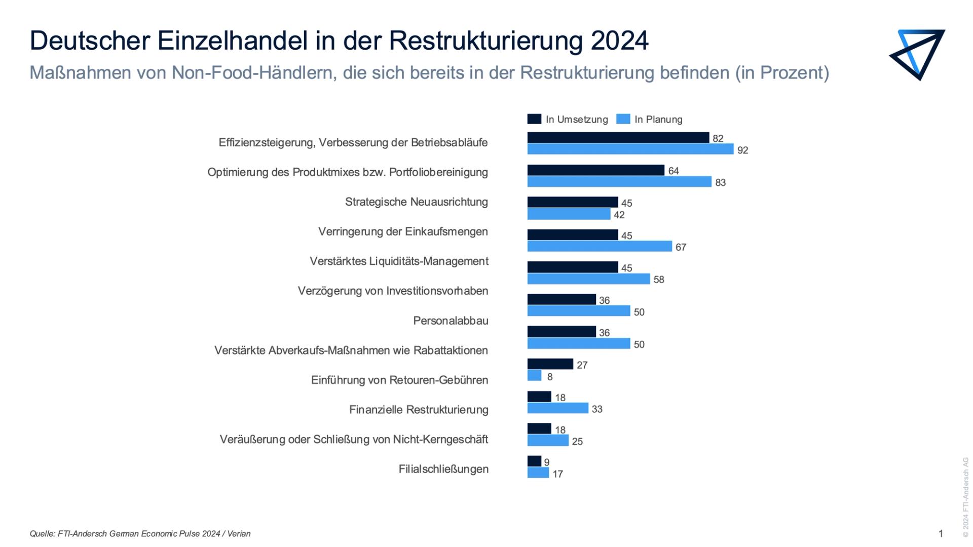 The market research company Verian (formerly Kantar Public) conducted a study titled 'German Economic Pulse 2024' on behalf of the consulting firm FTI-Andersch. This study involved telephone interviews with 200 companies in Germany from the automotive, machinery and plant engineering, consumer goods, and retail sectors, focusing on current topics such as economic outlook, restructuring, insolvencies, refinancing, and other structural challenges.