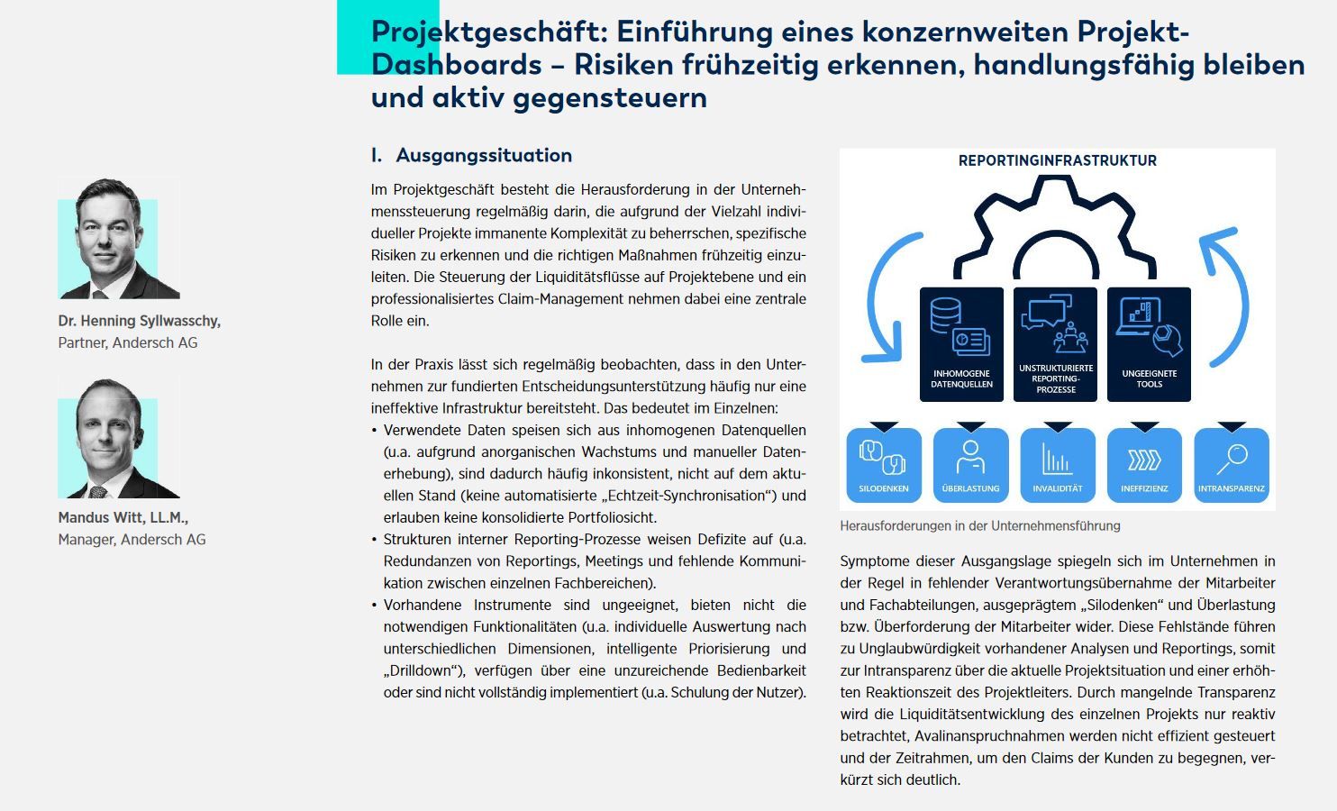 In the project business, the challenge in corporate management is regularly to master the complexity inherent in the large number of individual projects, to identify specific risks and to initiate the right measures at an early stage. The management of liquidity flows at project level and professionalized claims management play a central role here. In practice, it can regularly be observed that companies often only have an ineffective infrastructure in place for sound decision support. However, on the basis of a project dashboard that functions as a "single point of truth", targeted and addressee-oriented communication can be achieved within the company. Project managers, financiers and management can make structured and well-founded decisions. The addressees have a reliable tool at their disposal, which has been developed according to their information needs and integrates known data sources. Learn more in our article published in the e-book "GMBH-GESCHÄFTSFÜHRUNG 2021" by euroforum. [German version only]